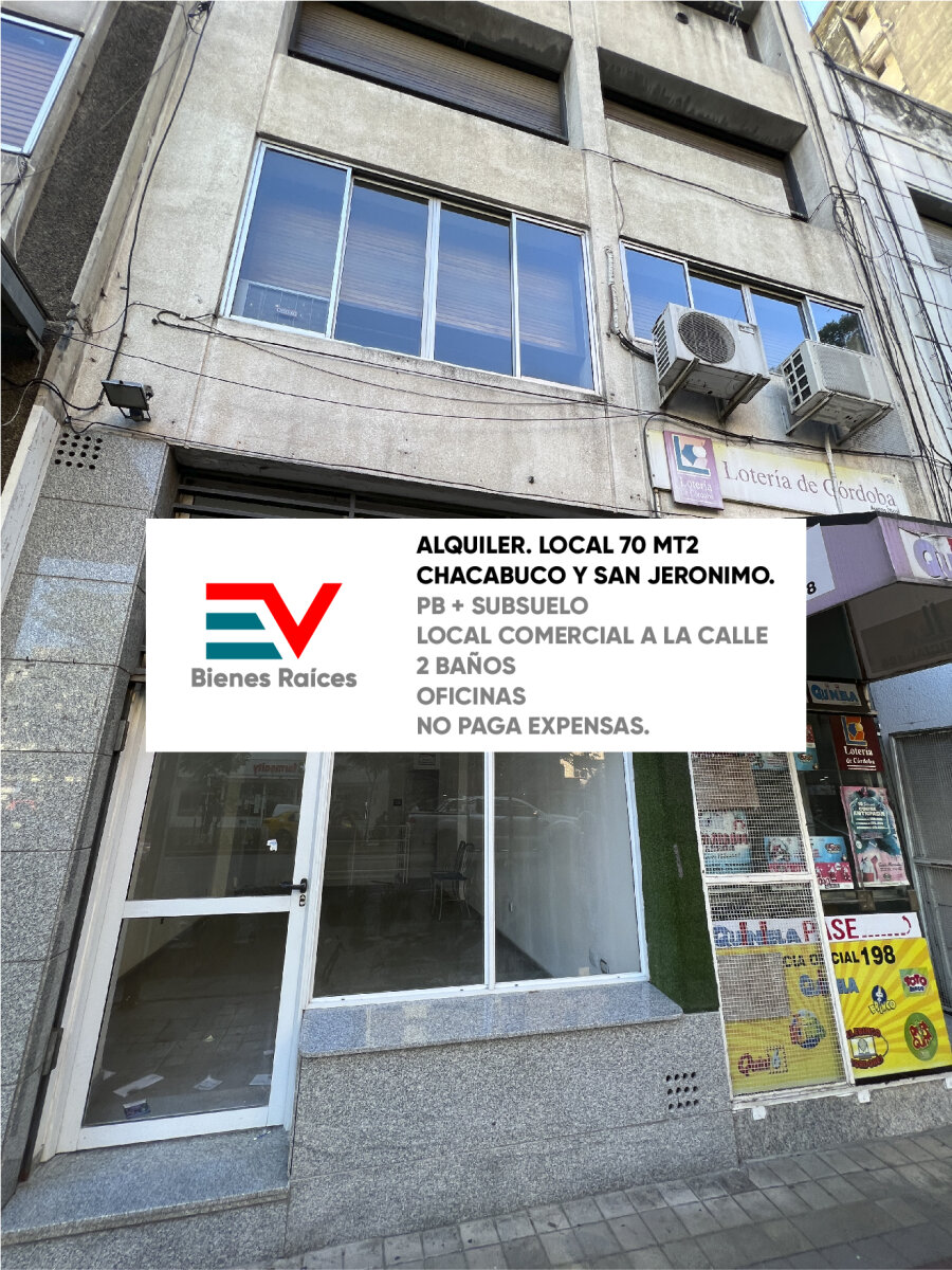 EXCELENTE LOCAL EN ALQUILER ESTRATEGICAMENTE UBICADO EN EL CENTRO DE CORDOBA CAPITAL SOBRE BOULEVARD CHACABUCO ENTRE SAN JERONIMO Y ROSARIO DE SANTA FE MTS TOTALES CUBIERTOS APROX: 70 M2 (40 + 30) *** NO PAGA EXPENSAS *** DETALLES DE LA PROPIEDAD LOCAL CON VIDRIERA A LA CALLE PLANTA BAJA: (40 M2 APROX) SALON COMERCIAL Y BAÑO PEQUEÑO CON ANTEBAÑO SUBSUELO: (30 M2 APROX) 3 OFICINAS BAÑO GRANDE CONSULTE EV BIENES RAICES